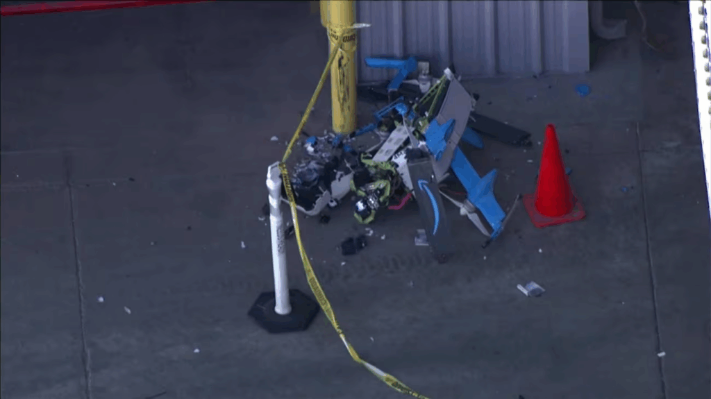 Police said one drone hit the ground in the same parking lot near the crane, while the second came down in the parking lot of a different business. No injuries were reported.